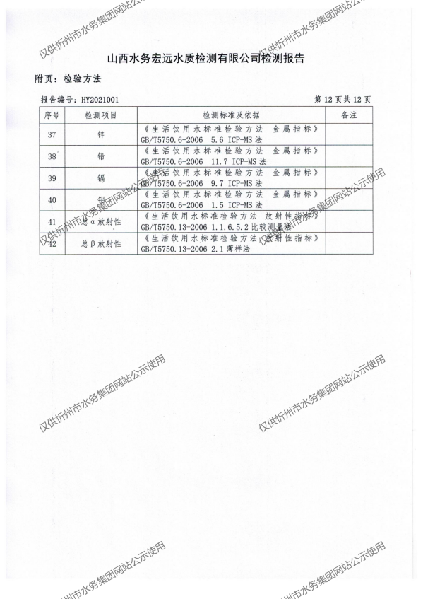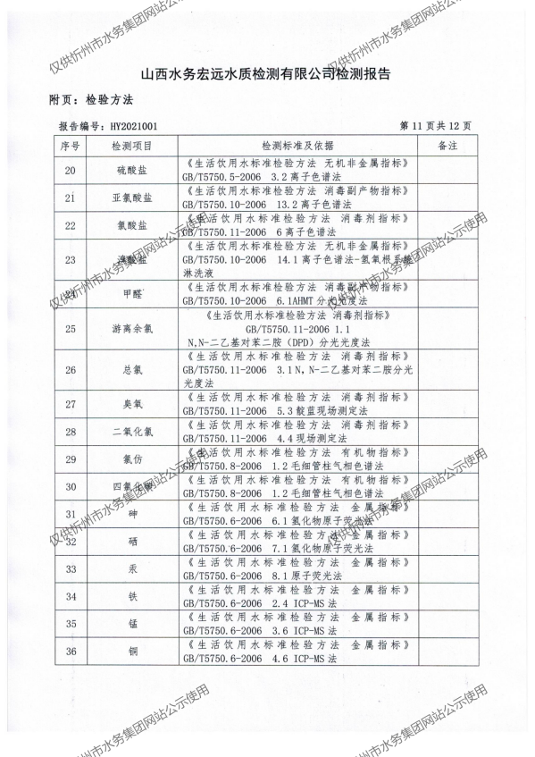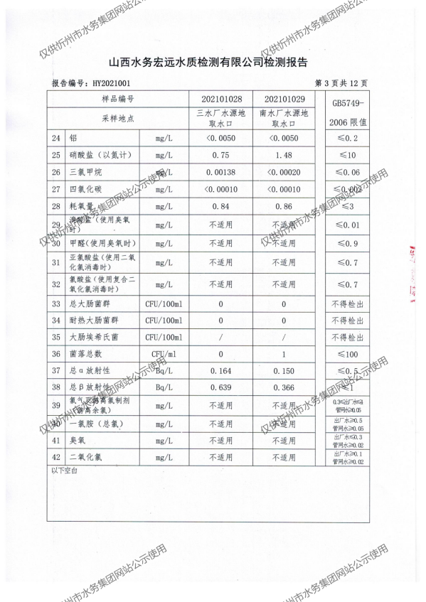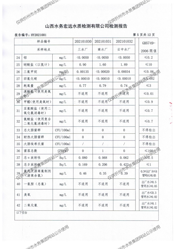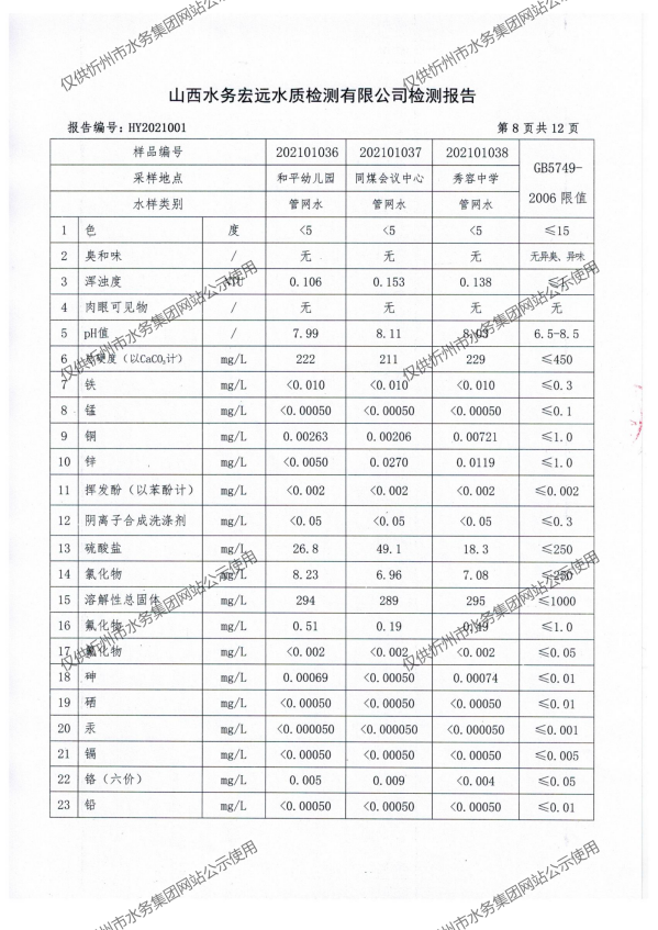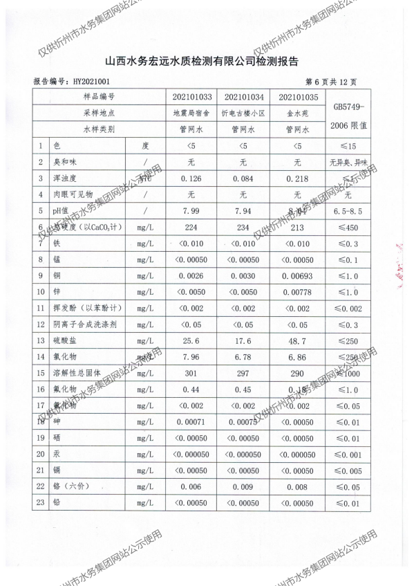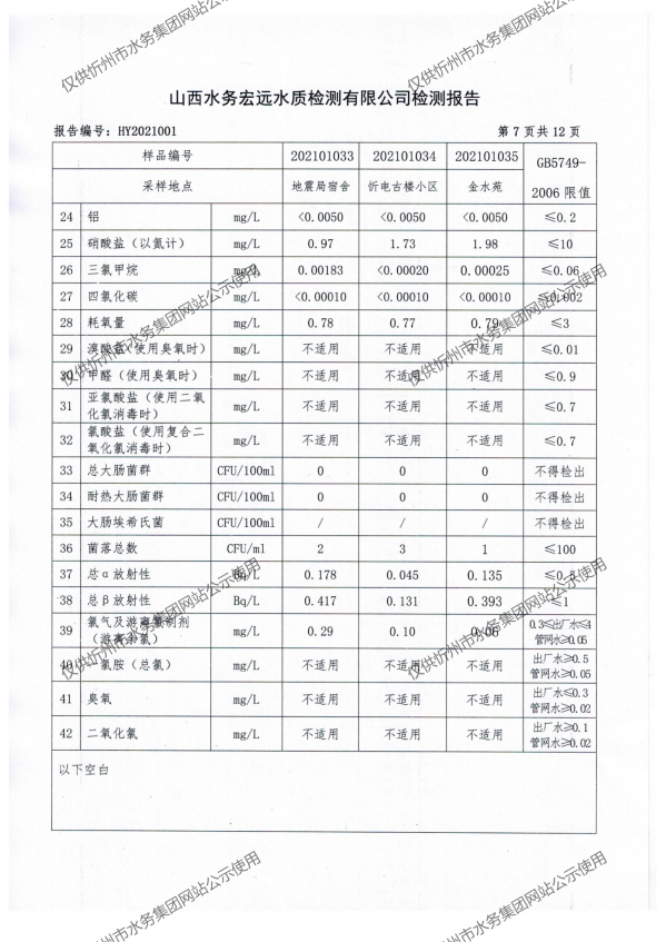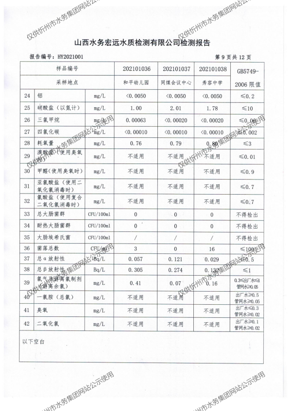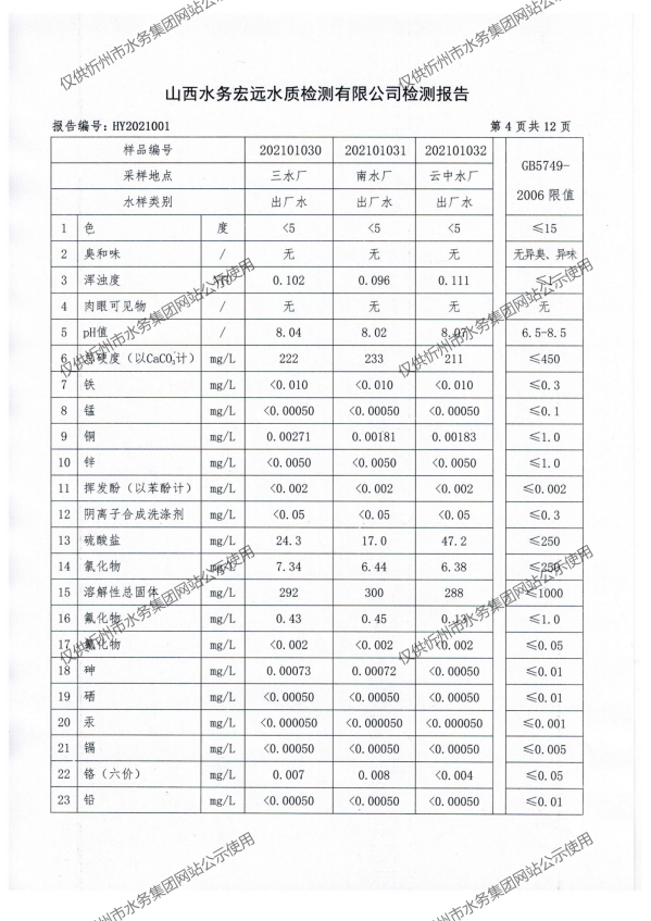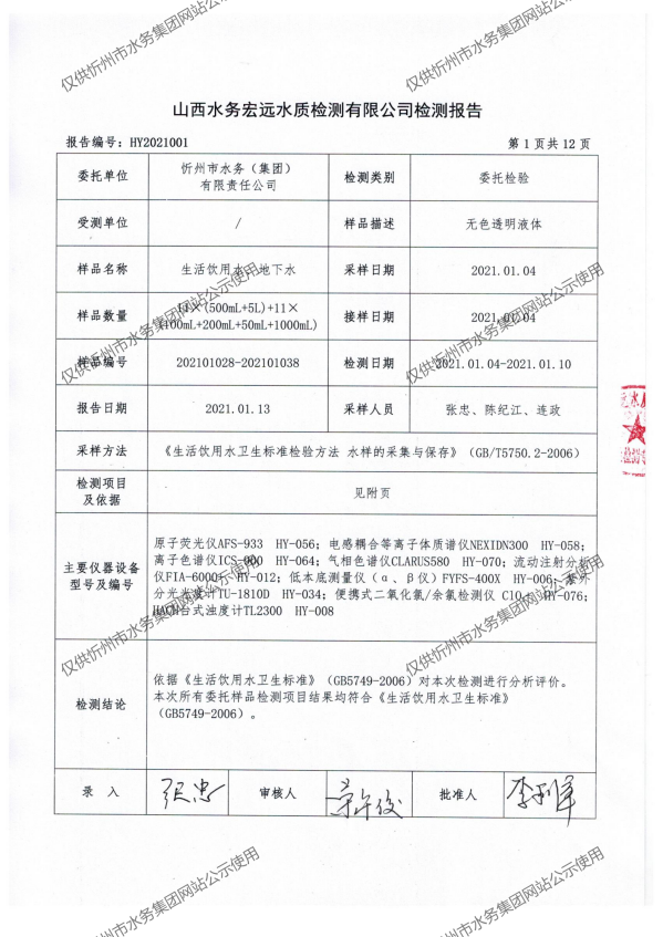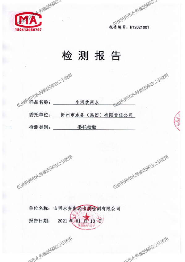 忻州城區(qū)公共供水水源水、出廠水、管網水、管網末梢水2021年1月份水質信息公示