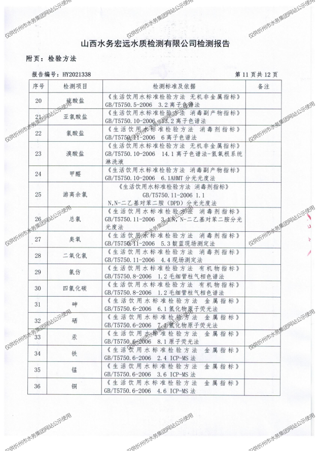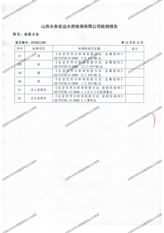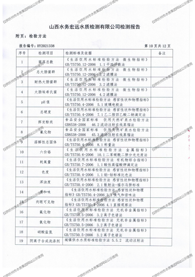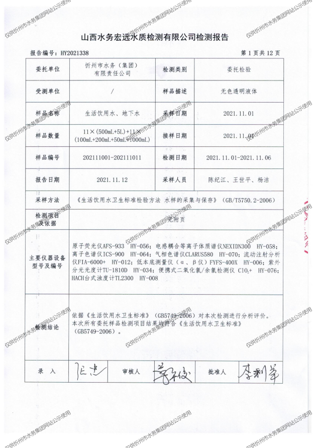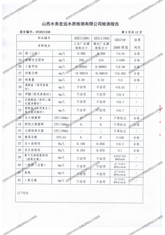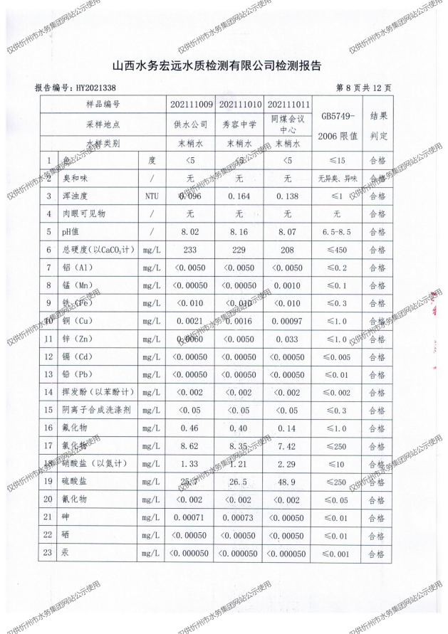 忻州城區(qū)公共供水水源水、出廠水、管網水、管網末梢水2021年11月份水質信息公示