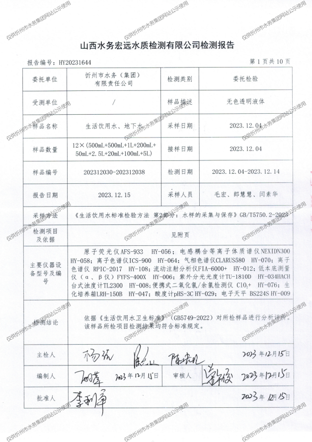 忻州城區(qū)公共供水水源水、出廠水、管網(wǎng)水、管網(wǎng)末梢水2023年12月份水質(zhì)信息公示